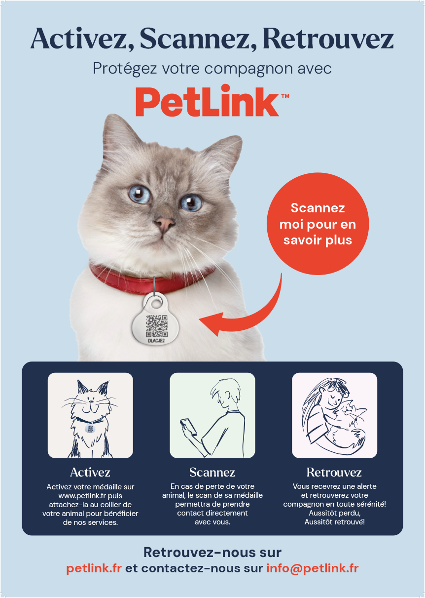 Les propriétaires ont une seule chose à faire : ACTIVER LA MÉDAILLE SUR HTTPS://PETLINK.FR. Et une fois enregistrée, la médaille doit être mise au collier de l’animal.